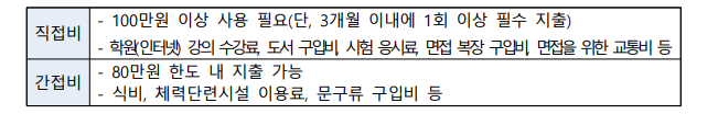 학원비, 온라인 강의, 도서 구입, 면접 정장, 체력단련비 등 구직활동에 필요한 항목에만 사용할 수 있어요. 사행성, 명품 등은 사용 불가입니다.