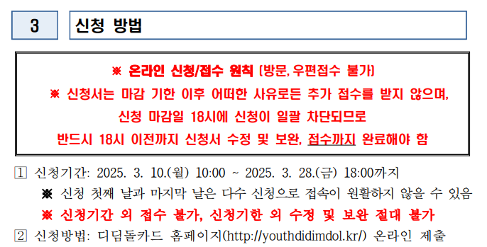 2025년 3월 10일(월) 오전 10시부터 3월 28일(금) 오후 6시까지 온라인으로만 신청 가능해요. 미리미리 서류 준비해두는 게 포인트!