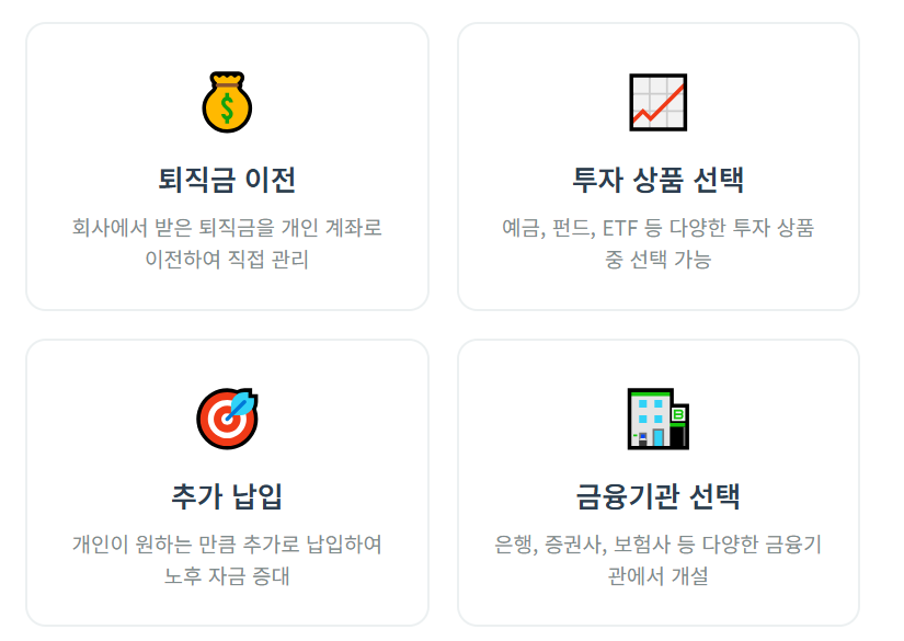 IRP는 퇴직금 또는 개인 납입금을 하나의 계좌에서 운용할 수 있도록 한 절세형 연금 계좌입니다. 퇴직자뿐 아니라 근로자, 자영업자, 프리랜서도 가입할 수 있습니다.