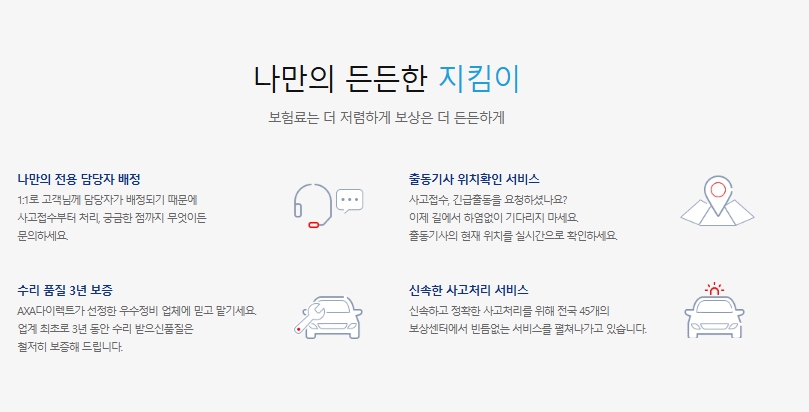 또한, AXA만의 신속한 긴급출동 서비스와 1:1 담당자 지원으로 언제 어디서나 든든한 보호를 받을 수 있습니다.