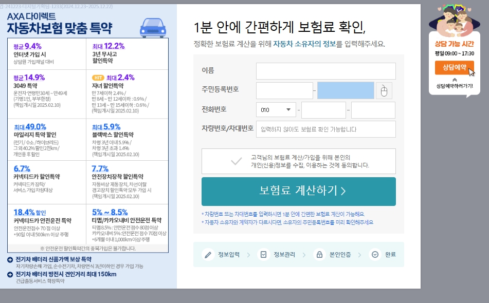 AXA 자동차다이렉트 보험은 인터넷을 통해 간편하게 가입할 수 있습니다. 복잡한 절차 없이 이름과 차량번호 입력만으로 보험료를 계산할 수 있어요. 또한, 인터넷 가입 시 다양한 추가 할인 혜택도 제공됩니다.